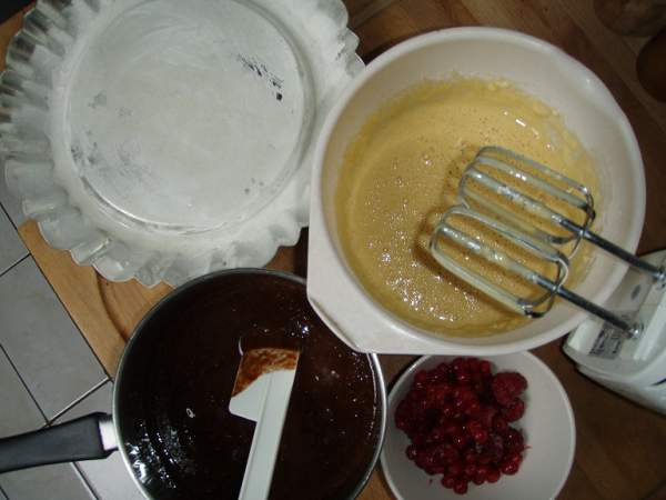 Jaja izmješajte sa šećerom, brašnom, praškom za pecivo i vanilin šećerom. U zdjelici na štednjaku istopite čokoladu sa margarinom ili maslacem, te je umešajte u prvu smjesu mikserom.