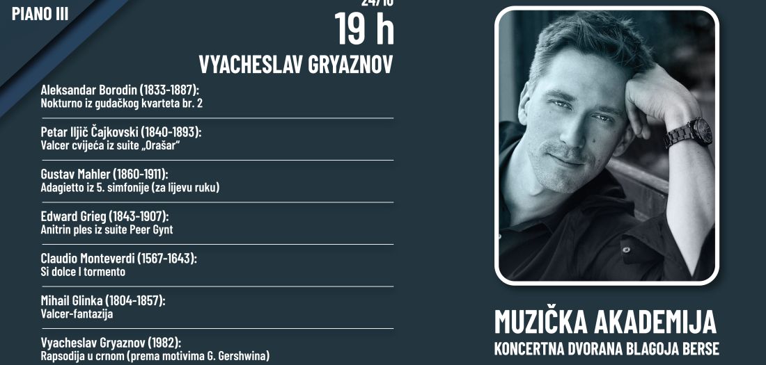 Nakon uspješnog otvaranja šestog izdanja međunarodnog pijanističkog festivala Piano3 na zagrebačkoj Muzičkoj akademiji recitalom Dore Petković koja je ispraćena oduševljenim pljeskom, na drugom koncertu koji će se održati u četvrtak 24. listopada u 19 sati, na scenu se – nakon pet godina stanke – vraća multitalentirani svestrani pijanistički virtuoz Vyacheslav Gryaznov čija je karijera posljednjih godina doživjela strelovit uspon, a on stekao ugled jednog od najistaknutijih mladih aranžera današnjice.