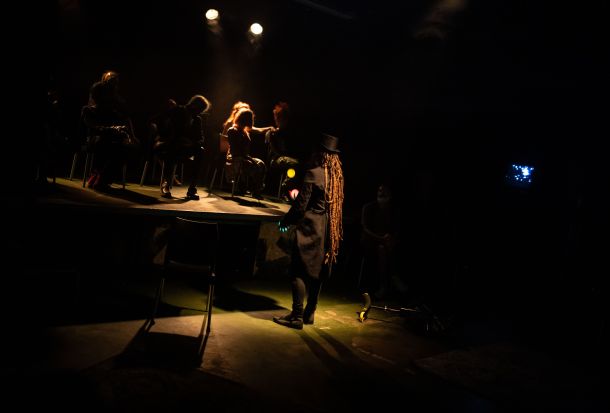 Opkoljena snažnim zvukovima, neobičnom rasvjetom, brojnim ekranima s tekstovima i naglim pojavljivanjem raznih likova, publika se postupno počinje osjećati djelom zbivanja.