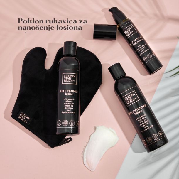 Sve je to sada stvar prošlosti jer je od sada na domaćem tržištu dostupna prava revolucija u samotamnjenju, Golden Star Beauty. Sastav ovih proizvoda je 100% organski, veganski, cruelty-free, dermatološki ispitan i najvažnije – BEZ parabena, štetnih kemikalija, umjetnih boja i mirisa i bez straha od narančastih mrlja po tijelu i odjeći. Ova kolekcija proizvoda za samotamnjenje sadrži losion za tijelo i serum za lice.