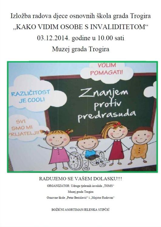 Već tradicionalno, u povodu Međunarodnog dana osoba s invaliditetom – 3. prosinca, Udruga tjelesnih invalida TOMS, Muzej grada Trogira te Osnovne škole „Petar Berislavić“ i „Majstor Radovan“ organiziraju izložbu učeničkih radova „Kako vidim osobu s invaliditetom“.