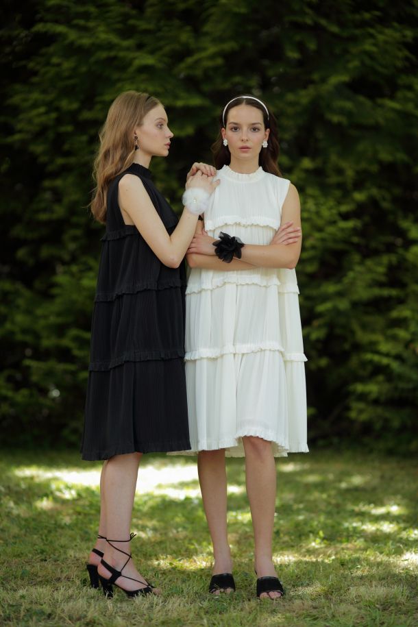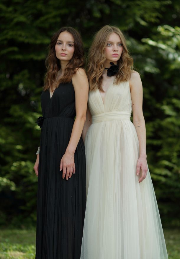 Dašak romantike i mekoće prisutan je u izboru crne i bijele plisirane pamučne tkanine od kojih su izrađene voluminozne haljine, a sanjivu estetiku donosi haljina od tila eterično se priljubljujući uz tijelo.