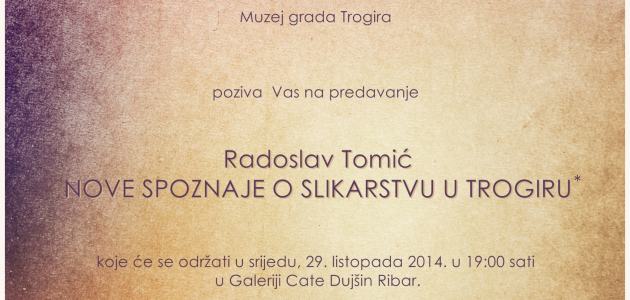 Nakon objavljene knjige Trogirska slikarska baština, istraživanje Radoslava Tomića o trogirskom slikarskom bogatstvu nije prestalo, dapače – nastavljeno je i obogaćeno nizom novih otkrića. U predavanju koje će se održati u Galeriji Cate Dujšin Ribar 29. listopada 2014., riječ će biti o novim spoznajama o trogirskom slikarstvu renesansnog, baroknog i klasicističkog razdoblja. Uz slikare Bartolomea i Benedetta Codea, Mateja Ponzonija, Pietra Della Vechiju, Georgija Lazzarinija… poseban naglasak autor će staviti na Giovannija Francesca Fedrigazzija, koji je početkom 18. stoljeća živio i stvarao u Trogiru i okolici, ostavivši iza sebe velik broj djela.