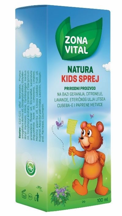 Natura Kids sprej iz linije Zona Vital je, zahvaljujući svom sastavu, blagog i ugodnog mirisa za ljude, ali neprivlačan i odbojan insektima. Potrebno ga je primijeniti na izložene dijelove tijela (lice, vrat, ruke i noge) i prema potrebi ponoviti postupak u redovitim vremenskim razmacima.