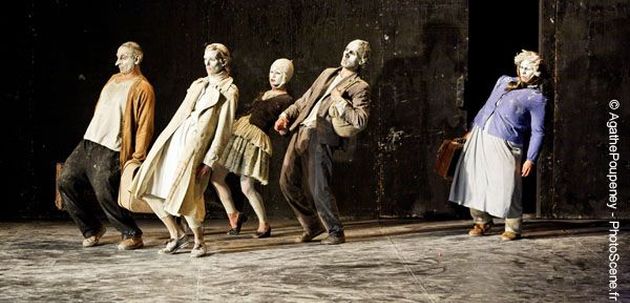 Po pet plesača i plesačica neodređene dobi, lica prekrivenih bijelom glinom (koja također prekriva pod) i odjeveni u dronjaste, „oprave“ (Louise Marin) kreću se mehanički precizno pri čemu ispuštaju neke čudne, pomalo zastrašujuće zvukove.