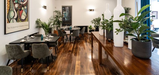 Uz dvije slike prostorom dominiraju velike vaze te brojni detalji koji će nam privući pažnju poput razigranih bakrenih svjetiljaka. Crno siva kombinacija stolova i stolica u kombinaciji s bijelom i smeđom bojom prostoru daje dozu otmjenosti, a veliki plavi zastori umiruju i daju toplinu.
