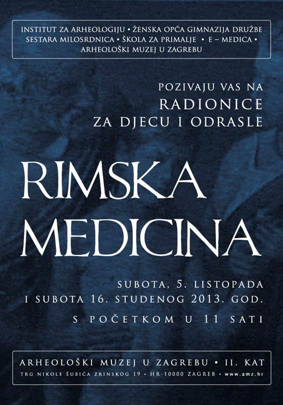 Kroz program E-medice, Institut za arheologiju, Ženska opća gimnazija Družbe sestara milosrdnica i Škola za primalje održat će u Arheološkom muzeju u Zagrebu radionice „Rimska medicina“. Na radionicama će se posjetitelji moći upoznati s razvojem rimske medicine, rimske bolnice i njezinim liječnicima, medicinskim instrumentima, ljekovitim biljkama i liječenjem rana.