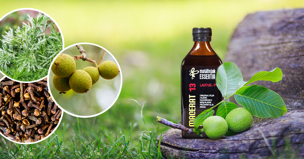 Macerat 13 Lautus u ulju oraha, savršen je saveznik u borbi protiv parazita. Pelin, klinčić i crni orah macerirani u 100% hladno prešanom ulju oraha, daju proizvod koji je prije svega nježan i djelotvoran. Pelin je biljka koja je izrazito moćna kada su u pitanju paraziti, a crni orah se već stoljećima koristi protiv gljivica i parazita koji uzrokuju bolesti kože. Orahovo ulje sadrži visoku biološku vrijednost (visok sadržaj polinezasićenih masnih kiselina), stoga snižava kolesterol i trigliceride te povoljno djeluje na mozak i štitnu žlijezdu. Što se tiče klinčića, riječ je o jedinstvenoj biljci koja sadrži eugenol (najmoćniju anti-mikrobnu tvar), koja ubija protozoe (najsitnije oblike organizama) i jedino je prirodno sredstvo koje uništava jajašca parazita.