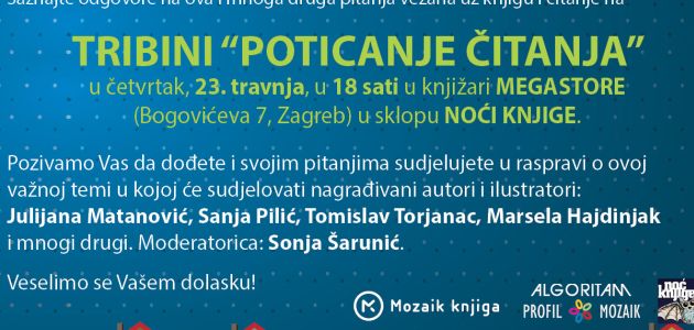 Pozivamo Vas da dođete na tribinu „Poticanje čitanja“ i svojim pitanjima sudjelujete u raspravi o ovoj važnoj temi u kojoj će sudjelovati nagrađivani autori i ilustratori: Julijana Matanović, Sanja Pilić, Tomislav Torjanac, Marsela Hajdinjak i mnogi drugi.
