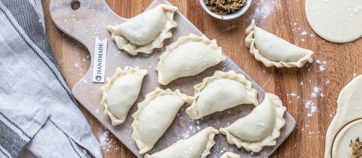 Tijesto razvaljajte na pobrašnjenoj podlozi što je tanje moguće. Na jednu polovicu tijesta stavljajte hrpice nadjeva (otprilike jednu žličicu) s razmakom od par centimetara. Preklopite drugu polovicu tijesta preko nadjeva i oko svake hrpice pritisnite prstima da istisnete zrak. Kalupom ili čašom izrežite polumjesece.