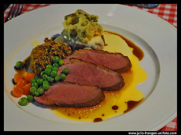 Iako je juha bila doista zasitna, glavno jelo je našlo svoj siguran put do svakog gosta – pačja prsa s krumpirom i medaljoni od svinjskog filea u omotaču od žumanjka i bućinih sjemenki. Uz njega se pio pušipel Kocijan iz 2012 te graševina 2012 Jakopić.
