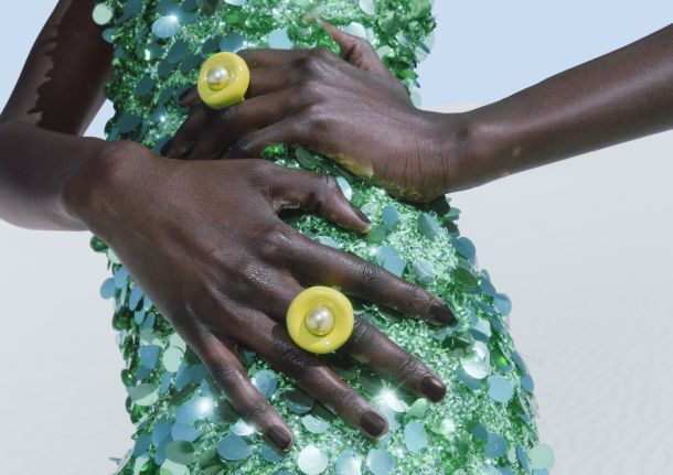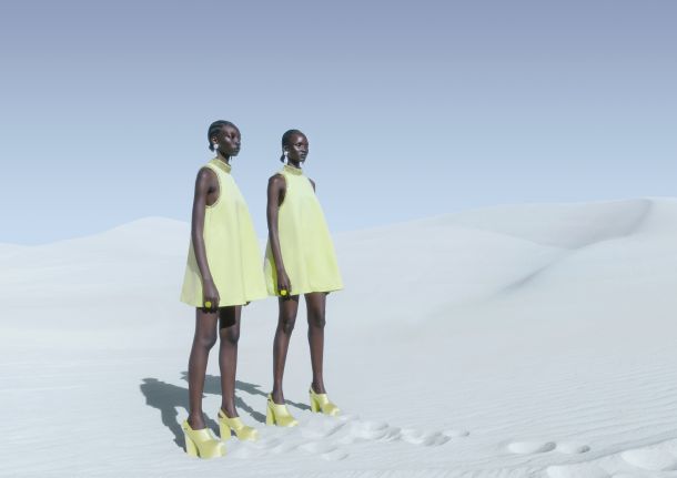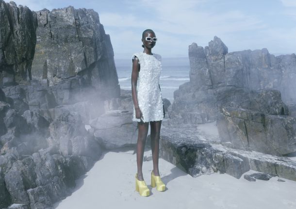 Par upečatljivih cipela s platformom od mješavine organske svile i viskoze, uz korištenje LENZING™ ECOVERO™ viskoze dobivene iz obnovljivih izvora drva, i upečatljivi nakit u blago nadrealističkim oblicima, izrađen od recikliranog mesinga nakon upotrebe, upotpunjuju kolekciju.