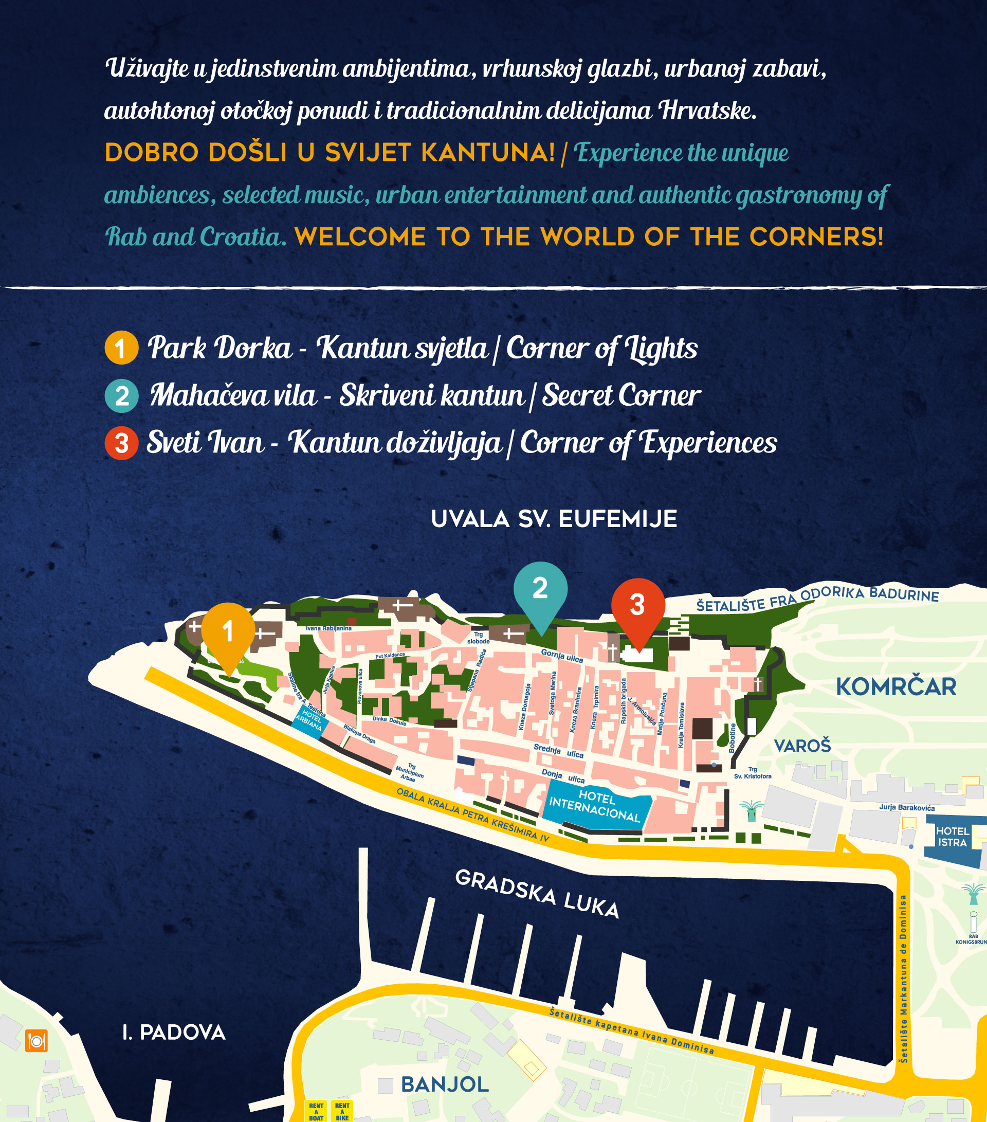 Već sedmu godinu zaredom KANTUNI predstavljaju i promoviraju čarobne ambijente i neponovljive ljepote Grada Raba, otkrivajući jedinstvene rapske lokalitete u spoju s detaljnim ambijentalnim uređenjem, biranom glazbom, urbanom zabavom i kvalitetnom ponudom.