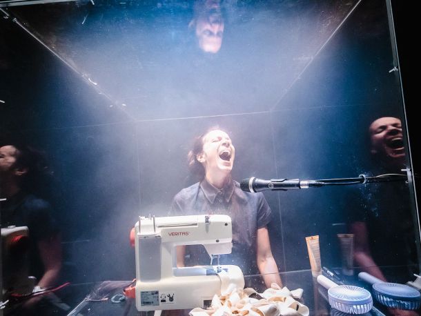 Odjevena u radničku kutu nabačenu preko čipkastog bijelog korzeta (Oliver Jularić), priučena švelja Brigitta (Beti Lučić) sjedi za šivaćom mašinom „zalokotana“ u kabini prozirnih zidova (scenograf Tomislav Ćurković) u kojoj se mijenja osvjetljenje (Tomislav Maglečić) i priča o žuđenom Heinzu kroz stisnute zube i uz ogorčenu grimasu.